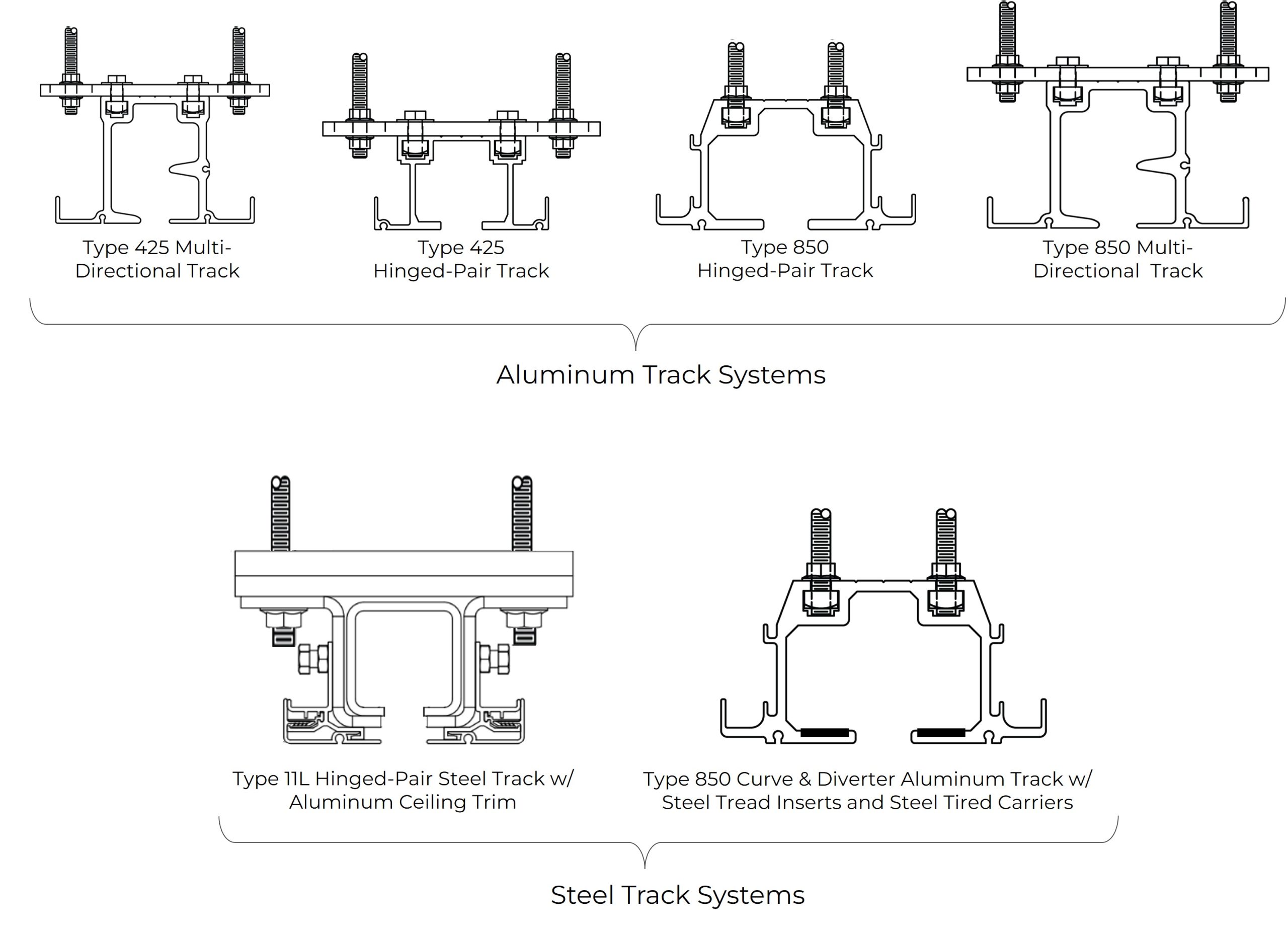 Kwik-Wall track and carrier systems are precision-engineered to support panel weights based on STC and partition height, facilitating smooth, quiet panel operation across track joints. Type 425 and 850 clear anodized aluminum track extrusions and Type 850 steel track deliver clean, crisp lines at your track and ceiling interface.